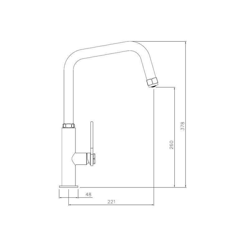 - Tap Dimensions: Overall Height – 378mm; Spout Height – 260mm; Spout Reach – 221mm; Base/Handle Width – 48mm