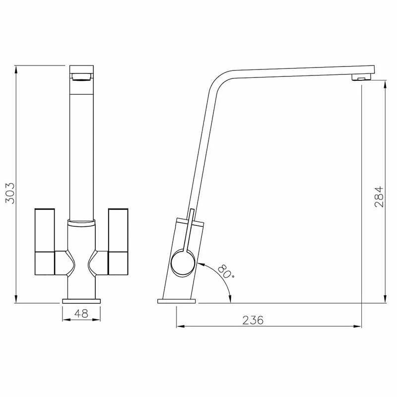- Tap Dimensions: Overall Height – 303mm; Spout Height – 284mm; Spout Reach – 236mm; Base/Handle Width – 48mm