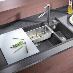 The Blanco Axia III 6 S Silgranit Kitchen Sink is the the perfect way to finish off any kitchen with ease, due to the flowing ergonomic work space along a single axis thanks to the arrangement of bowls and multifunctional accessories. This sink features a tight radii for maximum utilisation of the surface and volume, plus a movable glass cutting board for working directly into cooking dishes.
