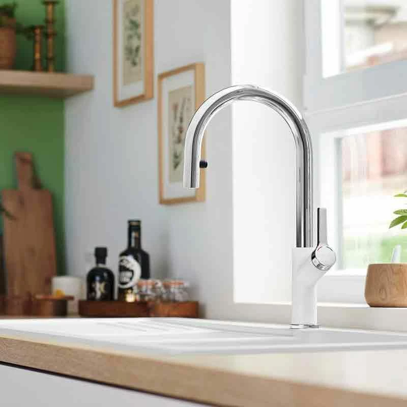 Mixer taps with a pull-out spray aren’t just the preserve of professional chefs. Enthusiastic home cooks also love their flexibility and versatility. Kitchen mixer taps with a pull-out spray offer a wider radius of action within the bowl. This makes filling up pots and other high-sided vessels like vases a breeze.