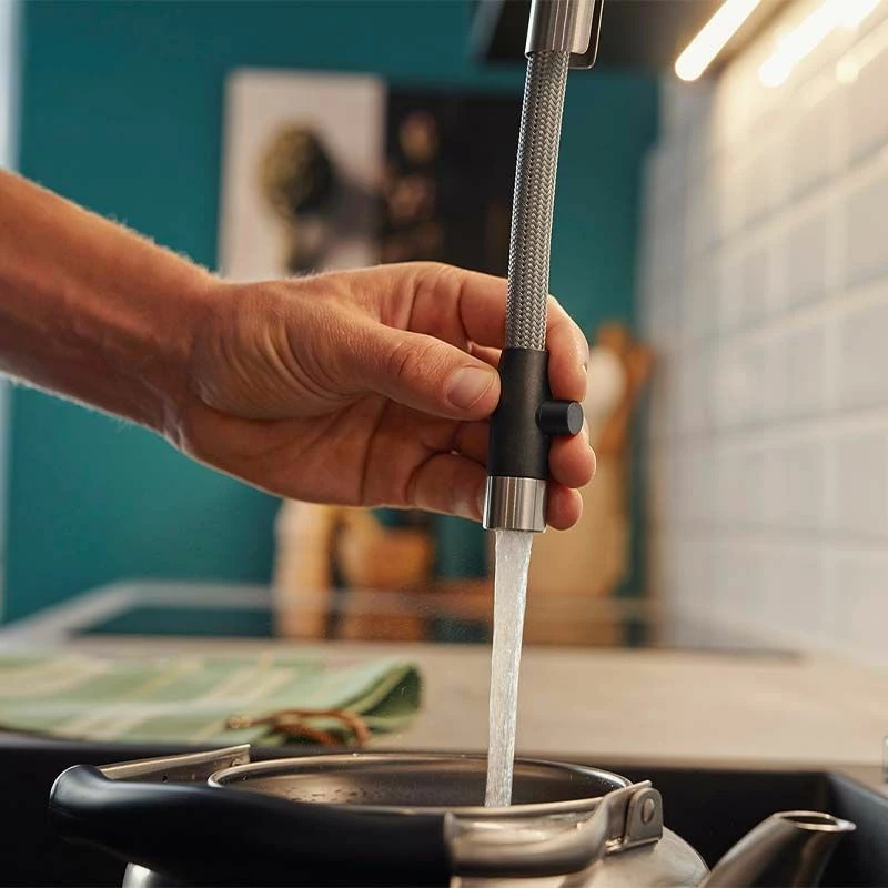 The Blanco JANDORA-S Pull-Out J-Shaped Spout Solid Kitchen Tap features a high-quality solid construction, concealed pull-out spray on flexible hose, and high arched J-shaped spout for easy filling of pots and vases. A clear mixer tap that is designed to sit perfectly in modern kitchens.