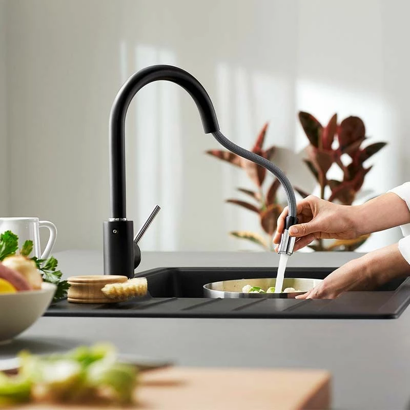 - Single lever monobloc mixer tap with pull-out metal tap head on a flexi-hose