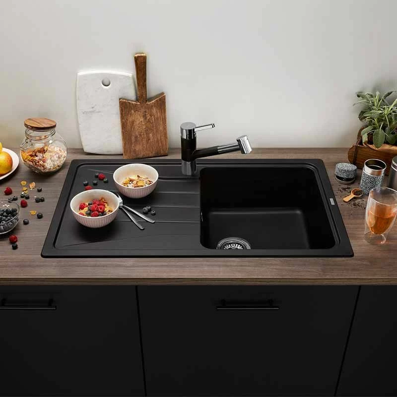 The Blanco SONA 5 S Reversible Kitchen Sink features a modern design with a particularly spacious bowl for even more room when in use. It is manufactured from silgranit which can easily withstand the everyday wear and tear due to being strong, long lasting and resistant to scuff marks from items such as knives, heavy pots and hot baking trays