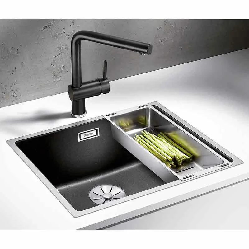 The Blanco SUBLINE sink is an elegant range of bowls in a silgranit or ceramic finish that meets even the hightest standards. The minimal bowl radii ensure maximum bowl capacity and characterise the clean, puristic look of this designer range. With its expressive SILGRANIT SteelFrame design, SUBLINE is integrated into the worktop to perfection. When combined with visually and functionally matching accessories, bowls from the SUBLINE range are also transformed into a practical working space. The SUBLINE thus rounds out the stylish overall look of your kitchen. SteelFrame is all about aesthetic appeal, functionality and individuality, making it the right choice for those who fancy something a bit individual and who appreciate harmonious kitchen design with a masterful mix of materials. In a nearly flushmounted look, the delicate stainless steel IF flat rim looks particularly elegant against the straight-lined bowl, while blending in with other stainless steel features, such as a Ceran hob or oven.