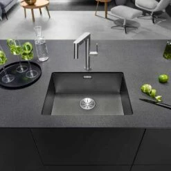The Blanco ZEROX 500-U Stainless Steel Kitchen Sink 526244 is pleasantly warm to the touch thanks to high-quality, pure, non-coated stainless steel in elegant, dark grey colour. One magnificent thing about this sink is its ability to be combined with a plethora of colours and materials with ease. It features a spacious single bowl, providing ample room for various kitchen tasks, from washing dishes to food preparation. This sink is constructed from premium stainless steel, known for its durability, resistance to corrosion,and long lasting performance.
