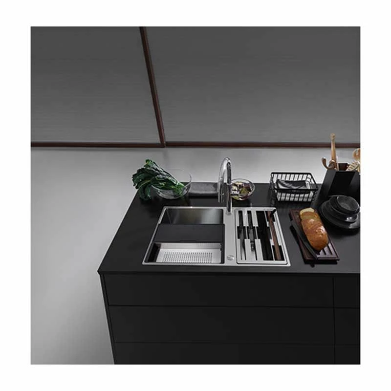 Manufactured from high quality and durable stainless steel, the double bowl provide for an optimum kitchen workflow because everything is within reach. They also offer complete cleanliness, the bowls are easy to clean and all removable compartments can simply be taken out and washed ready to use again. During the day, the elegant accessories are easily accessible for food preparation because they are completely integrated in the main bowl. At night, the accessories can be safely stored in the compartment bowl and will dry entirely overnight. Designed to fit a 900mm cabinet, this sink is also reversible and backed by a 50 years guarantee for a peace of mind.