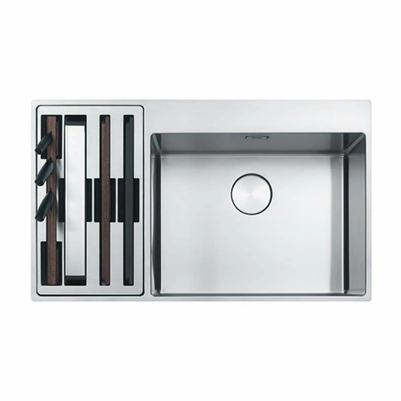 Manufactured from high quality and durable stainless steel, the double bowl provide for an optimum kitchen workflow because everything is within reach. They also offer complete cleanliness, the bowls are easy to clean and all removable compartments can simply be taken out and washed ready to use again. During the day, the elegant accessories are easily accessible for food preparation because they are completely integrated in the main bowl. At night, the accessories can be safely stored in the compartment bowl and will dry entirely overnight. Designed to fit a 900mm cabinet, this sink is fitted with sound deadening pads and backed by a 50 years guarantee for a peace of mind.