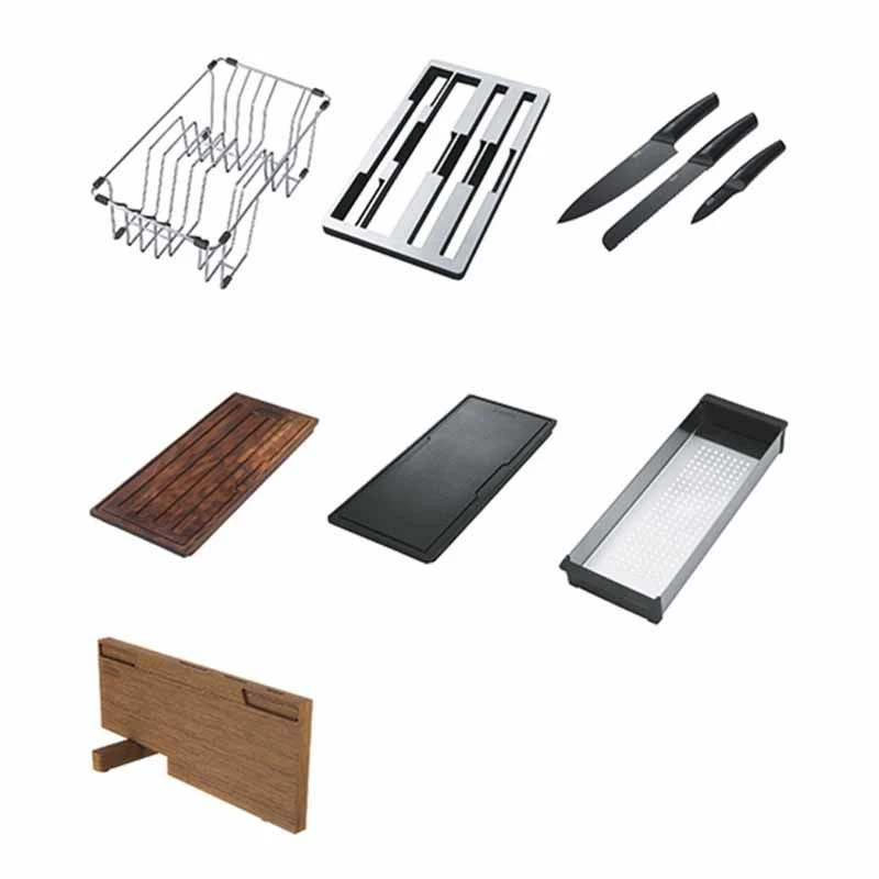 - Accessories included in the box: 3 knives, chopping boards (1 wood, 1 plastic sanitized), strainer bowl, pop up waste and flush cover.