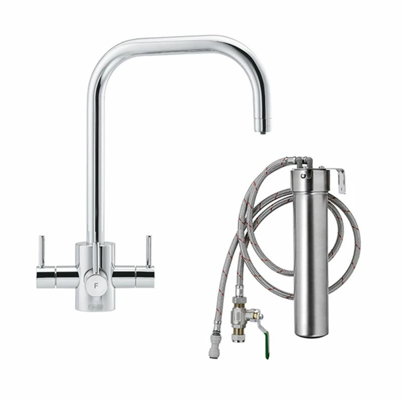 Franke FilterFlow tap is connected to a compact filter system that is fitted below the sink. When you select the tap’s third lever, cold water is diverted through the filter system. The system’s filter cartridge removes contaminants before the freshly filtered water travels back through a dedicated waterway inside the tap spout. Appearance wise, the stylish tap has a tough brass construction with modern U spout design making sure that the water covers all parts of the sink. Coated in a sparkling chrome finish, the tap is the perfect complement to your kitchen sink.
