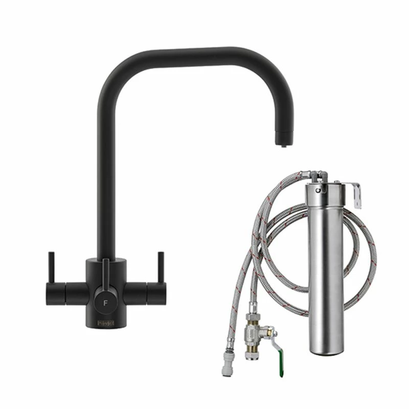 Franke FilterFlow tap is connected to a compact filter system that is fitted below the sink. When you select the tap’s third lever, cold water is diverted through the filter system. The system’s filter cartridge removes contaminants before the freshly filtered water travels back through a dedicated waterway inside the tap spout. Appearance wise, the stylish tap has a tough brass construction with modern U spout design making sure that the water covers all parts of the sink. Coated in matt black finish, the tap is the perfect complement to your kitchen sink.