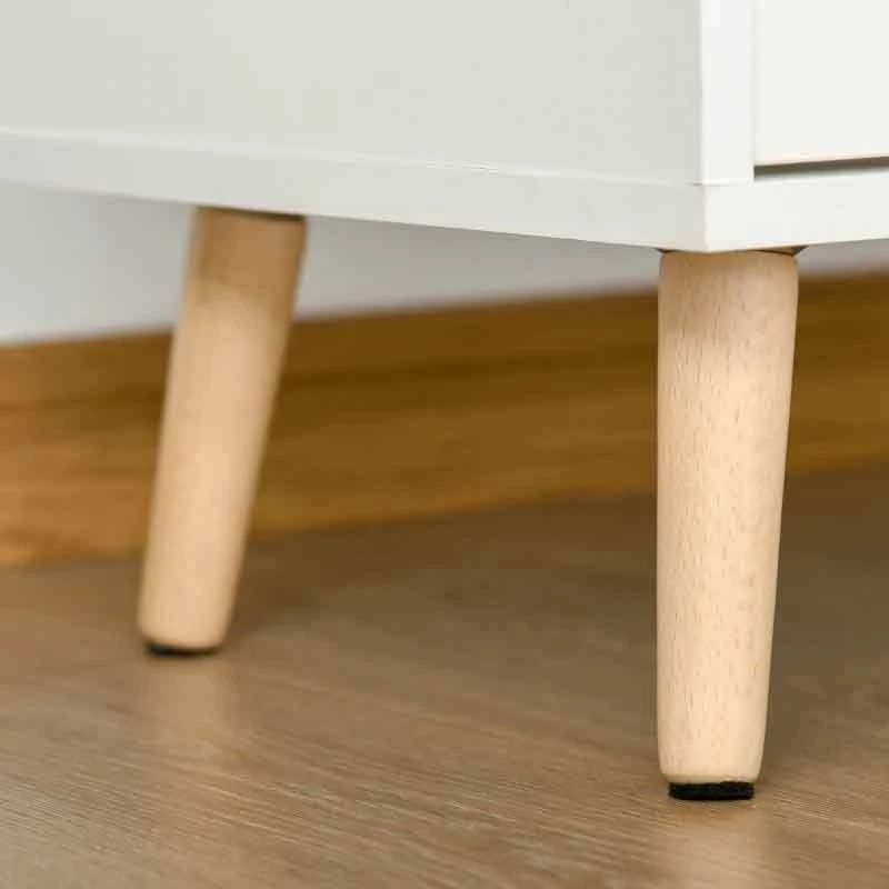 The cabinet is made from particle board and features five wooden legs for stability. The door is finished with glass panels and handles for easy opening and closing. The cabinet is designed for everyday use.
