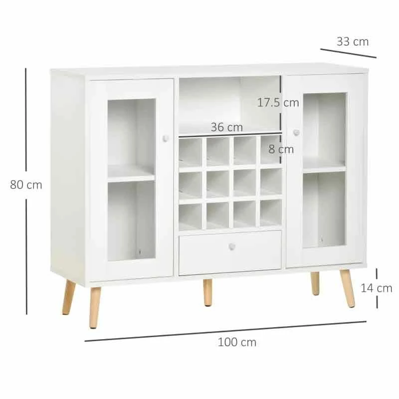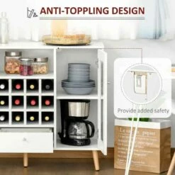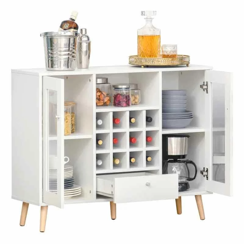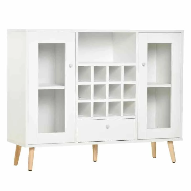 This HOMCOM multi-use cabinet offers a stylish and efficient home dining storage solution. It features a 12-bottle wine rack, a top shelf, small drawers, and a cupboard on both ends.