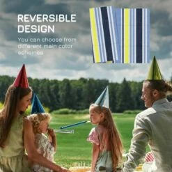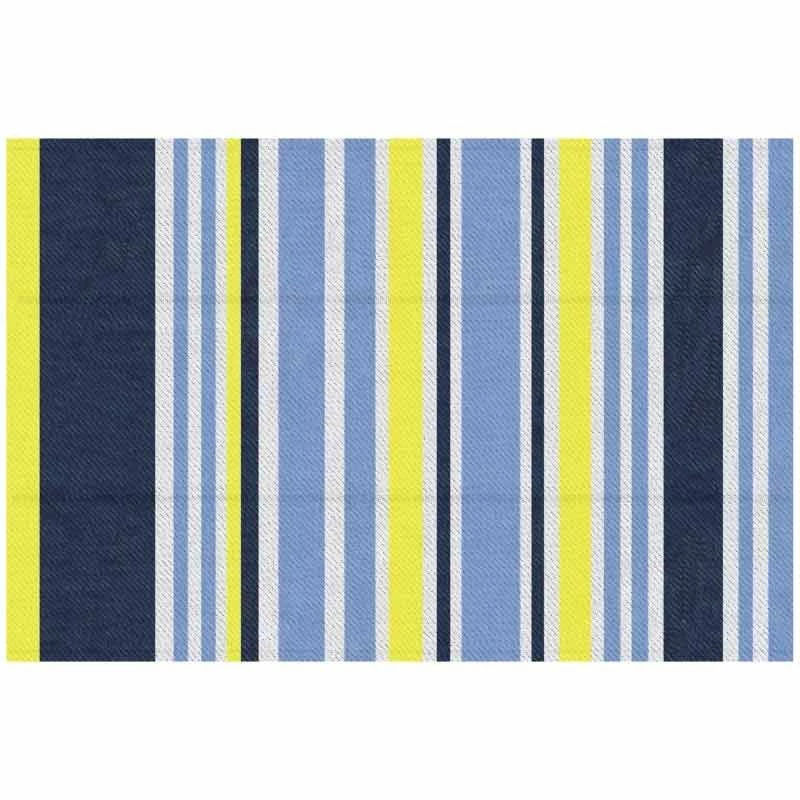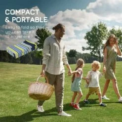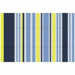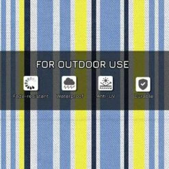 Experience the convenience and versatility of the Outsunny Waterproof Outdoor Rug for all your outdoor activities. Whether it’s camping, picnics, festivals, or enjoying your own garden, this outdoor rug is a perfect companion. Simply fold it and take it wherever you go. Made from durable and water-resistant polypropylene with a protective coating, it can withstand outdoor use and prevent sun fading and damage. The reversible design allows you to switch sides when one gets dirty, extending its usability. With its stylish dark blue, light blue, yellow, and white stripe pattern, it adds a touch of vibrancy to your outdoor space. Enhance your outdoor adventures with this practical and eye-catching outdoor rug.