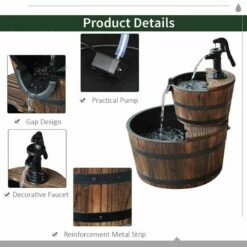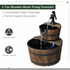 Enhance the beauty of your garden with the charming Outsunny outdoor 2 tier wooden water feature. Crafted from durable fir wood and designed in the shape of barrels, this fountain adds a rustic and elegant touch to your outdoor living space. The two-tier design features cascading waterfalls that flow from the pump into the barrels, creating a soothing and tranquil atmosphere for you to enjoy in your garden. With a rotate speed of 3600r/min, the water pump ensures a steady flow of water, while the switch allows you to control the water volume. Made with high-quality materials and CE certification, this water feature is built to last. Assembly is easy, and the fountain comes with a British standard plug for convenient use.