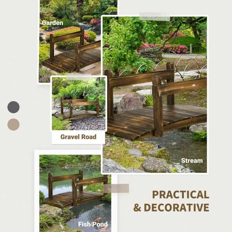 Add a touch of charm and elegance to your backyard garden, pond, or small stream with the Outsunny Wooden Garden Bridge with Planters. This exquisite landscape decor piece serves as the perfect centerpiece, creating a picturesque and serene atmosphere in your outdoor space. Crafted from solid fir wood with a stained finish, this pond bridge not only looks wonderful but also ensures long-lasting durability by resisting rot, cracking, and splitting. The handrails with planters not only provide security but also add a touch of elegance, allowing you to incorporate your favorite plants and flowers into the bridge design. The bridge features two leaking holes for good drainage, ensuring the health and vitality of your plants
