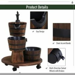 Add a unique touch to your garden with the Outsunny fir wood 3 barrel water fountain. This charming fountain features a three-pot design with a top tap, creating a visually appealing water flow that gently overflows into the pots. Powered by electricity, the pump rotates at 3600r/minute, efficiently bringing the water at the bottom back to the top and preventing any wastage. The solid fir wood body in a rustic finish adds a touch of natural beauty, while the plastic-lined buckets ensure durability and prevent damage and rotting caused by water. The round base is equipped with two locking wheels, allowing for easy movement and secure placement. Vintage steel bands on the barrels add a beautiful finish to this fountain.