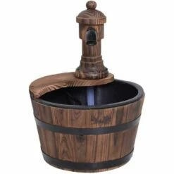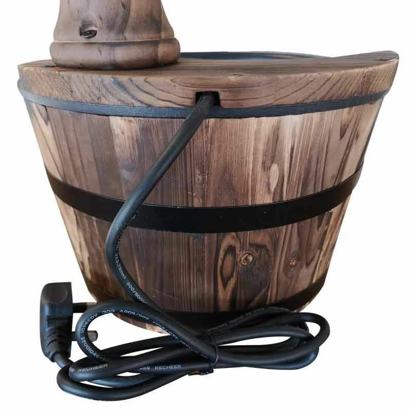 - Retro styled wood barrel fountain pump adds a unique touch to your garden and outdoor areas