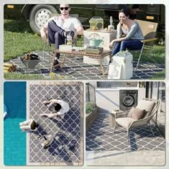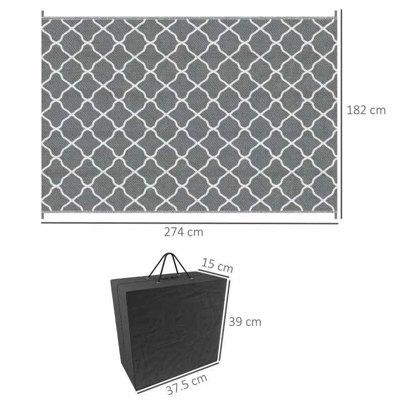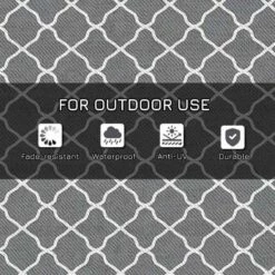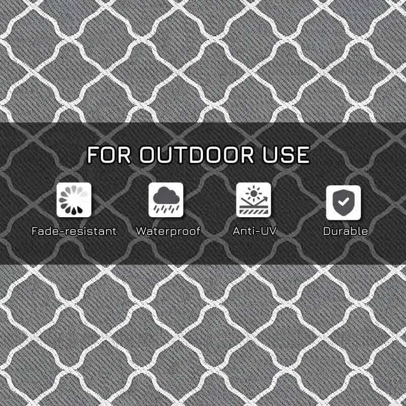 Enhance your outdoor experience with the Outsunny Waterproof Outdoor Rug. This versatile garden rug is perfect for camping, picnics, festivals, or simply relaxing in your garden. Its foldable design allows for easy portability and storage. Made from durable and water-resistant material, it withstands outdoor use. The reversible design provides the option to use both sides, extending its lifespan. With a protective coating, it resists sun fading and damage. The outdoor carpet comes with corner straps and ground nails for secure placement. It includes a convenient carry bag for safe transportation. Create a cozy and stylish outdoor space with this functional and practical outdoor rug.