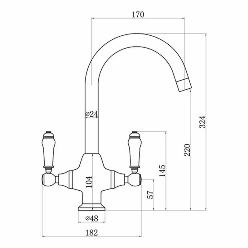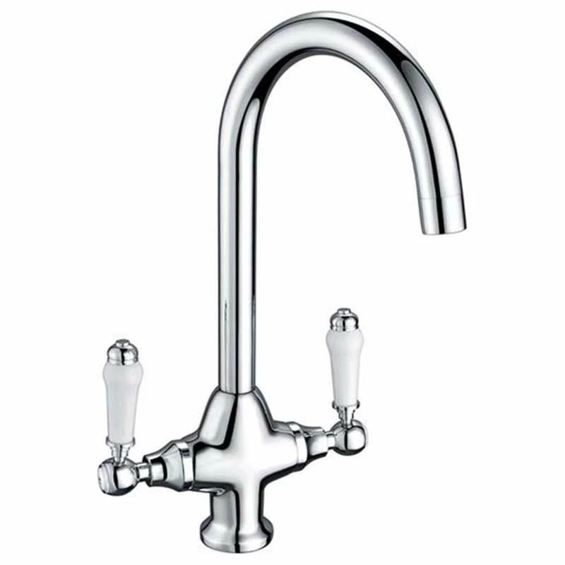 The Prima Traditional Belfast dual lever kitchen tap adds a stylish design feature to fit your space offering the best through design and functionality, creating an appealing finish to match perfectly with other fittings. With a unique J spout design and traditional build, the mixer suits any traditional/country style kitchen and fits perfectly with ceramic or belfast kitchen sinks.