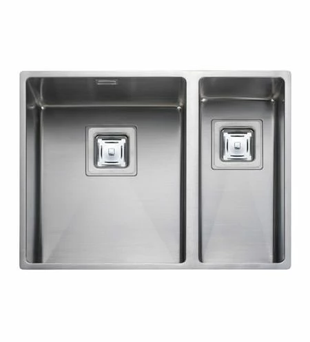 The Rangemaster Atlantic Kube 1.5 Bowl Right Hand Small Bowl Stainless Steel Undermount Kitchen Sink creates a geometric effect thanks to its dramatic 10mm radii corner profiling and modern square waste and overflow design.