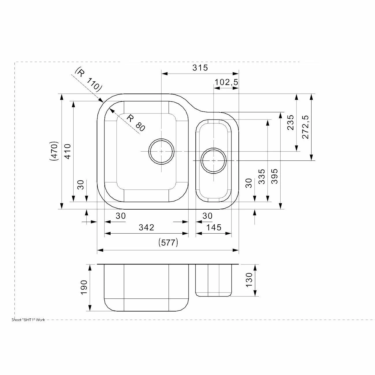 - Sink unit dimensions: 342 x 410mm / 145 x 335mm